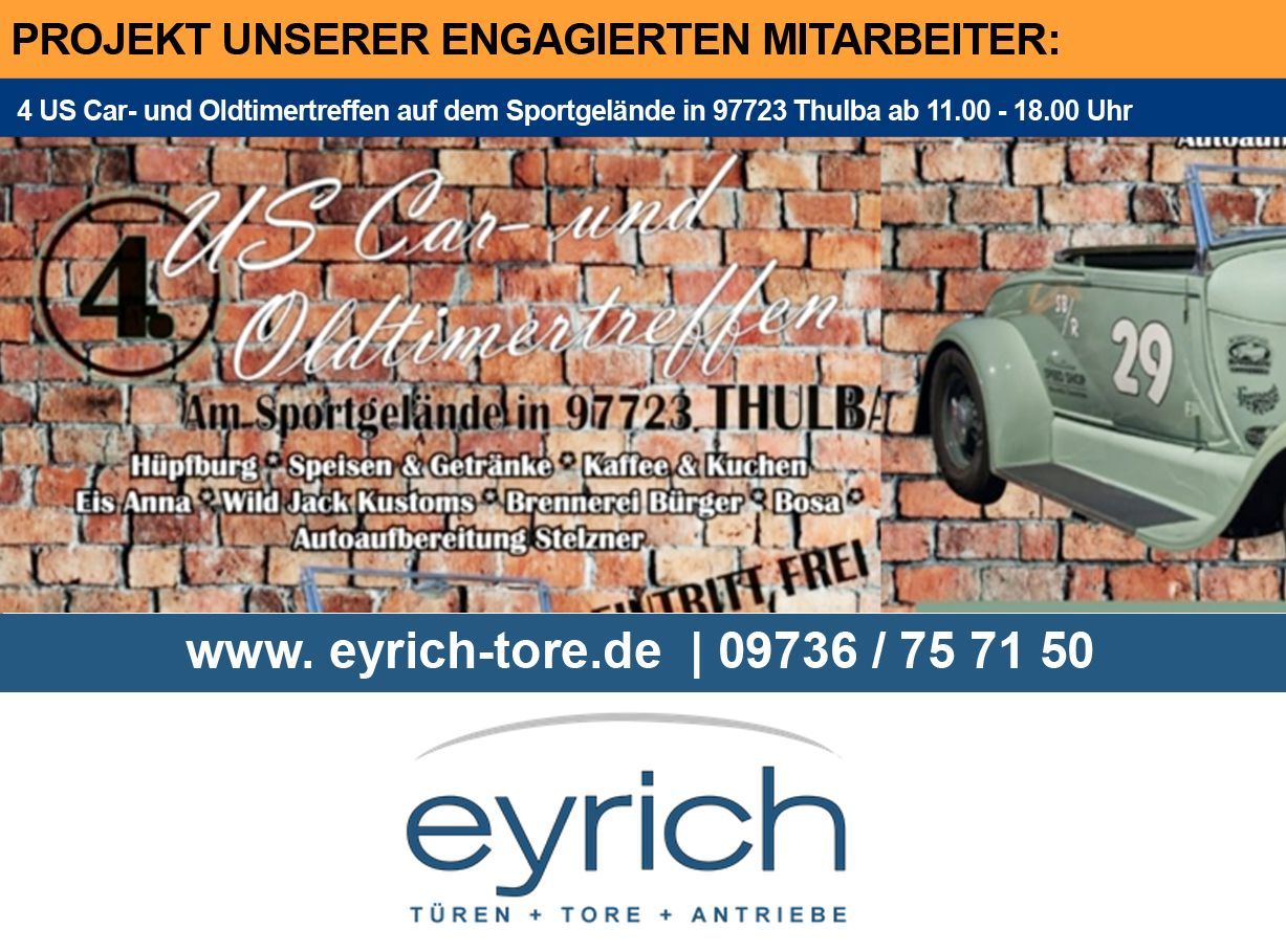 Auch in diesem Jahr möchten wir wieder gerne die persönlichen Leidenschaften und das liebevolle Engagement unserer Mitarbeiter unterstützen. Vielleicht haben Sie ja am Wochenende noch nichts vor und Lust auf einen kleinen Ausflug zum 04. US Car- und Oldtimertreffen ? Auf dem Sportgelände in 97723 Thulba wird von 11.00 Uhr bis 18.00 Uhr eine Menge geboten: > Hüpfburg > Speisen und Getränke > Kaffee und Kuchen > Eis Anna > Wild Jack Kustoms > Brennerei Bürger > Bosa > Autoaufbereitung Stelzner und natürlich die Kernstücke der Veranstaltung Fahrzeuge bis Baujahr 1985 > Oldtimer > Motorräder > US Cars > Traktoren Das Ganze wird veranstaltet von Stämauerclub Thuba e.V. Wir wünschen den Veranstaltern einen erfolgreichen Sonntag, viele neugierige Besucher und natürlich eine Menge Spaß und Freude.